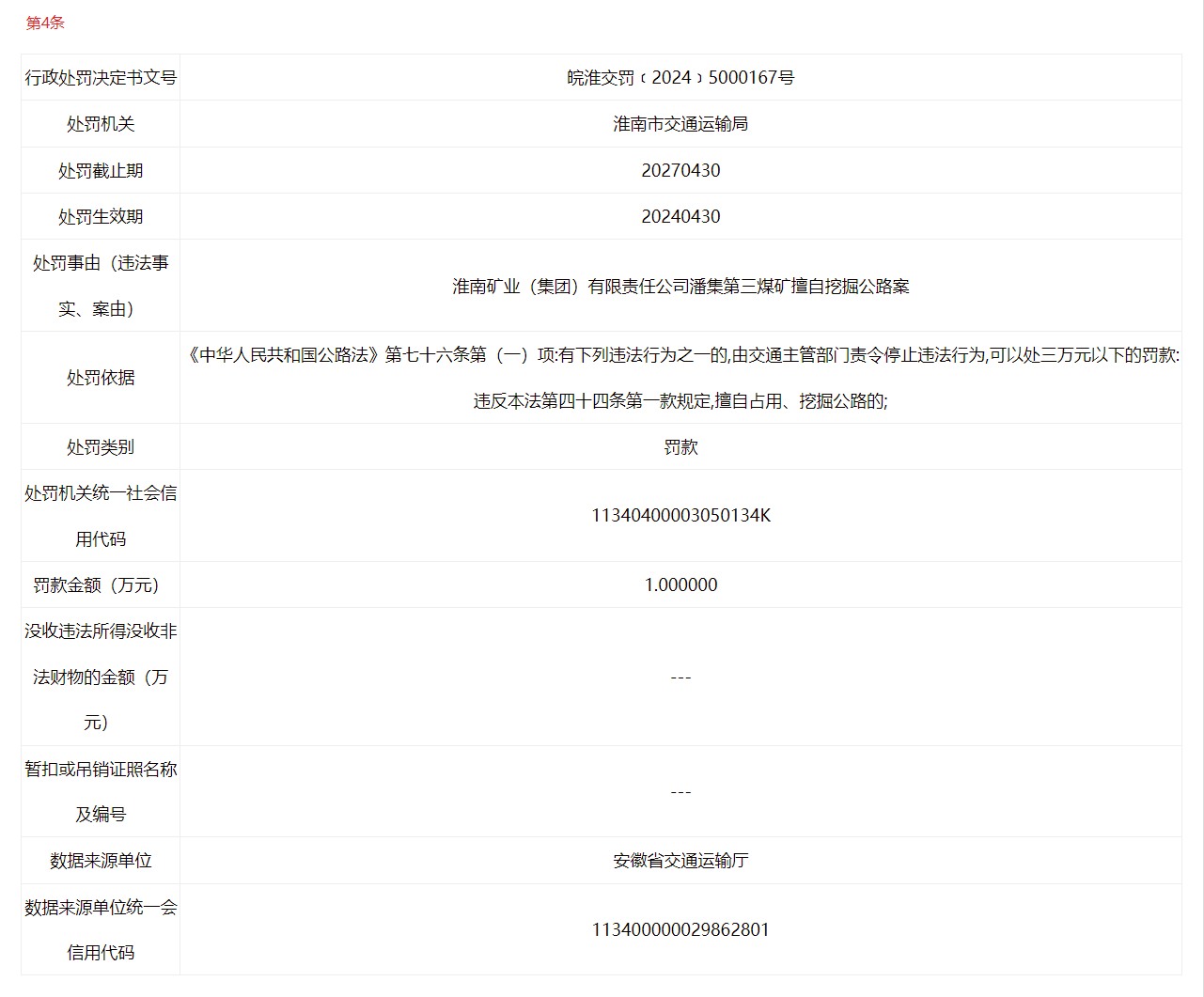 同日,因在公路建筑控制区内修建地面构筑物,淮南矿业(集团)有限责任公司潘集第三煤矿被罚款0.5万元。