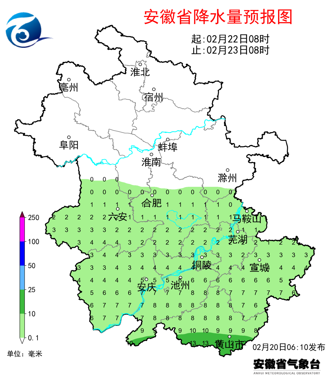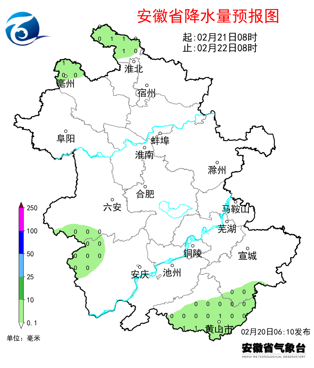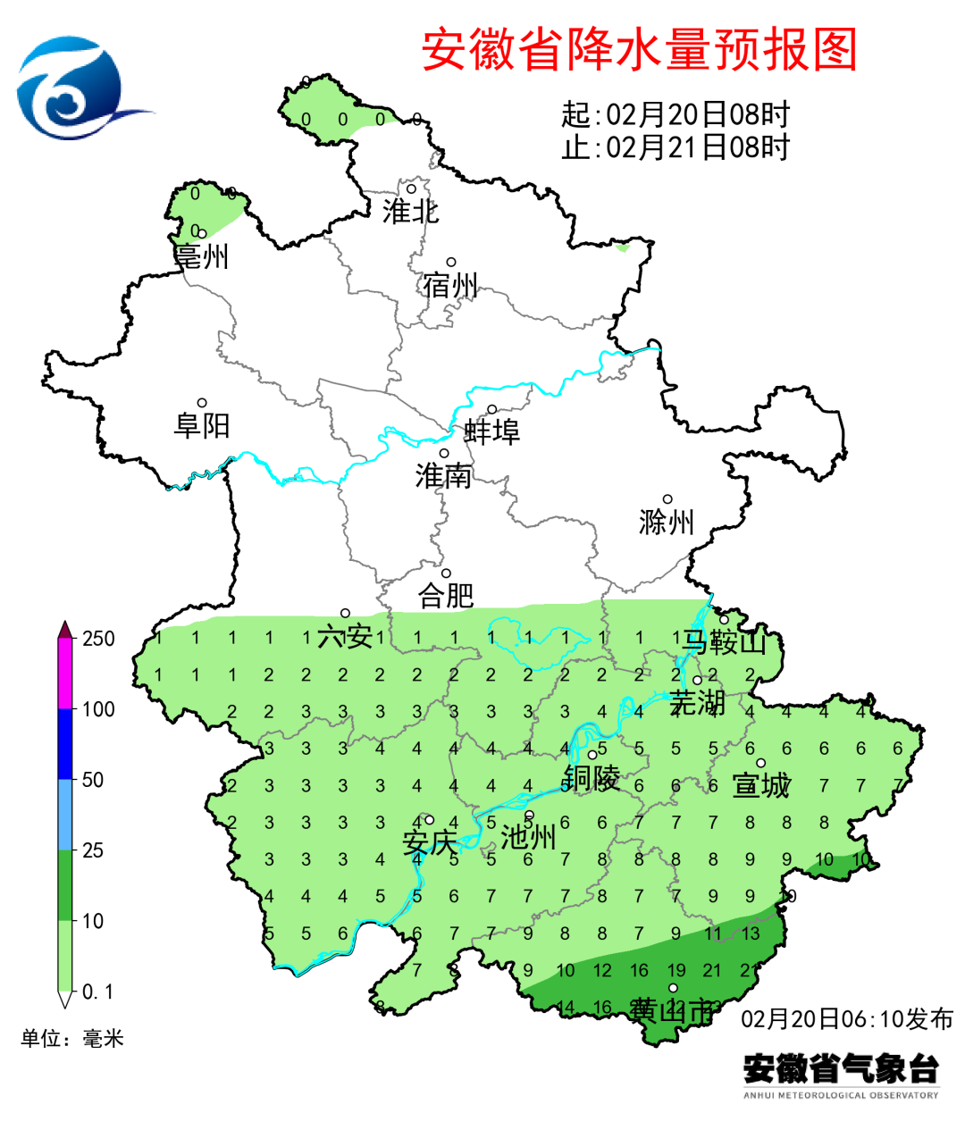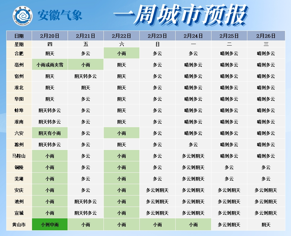 20日(周四):全省阴天,淮北地区北部和淮河以南部分地区有小雨,其中江南南部中雨,高海拔山区有雨夹雪或雪。