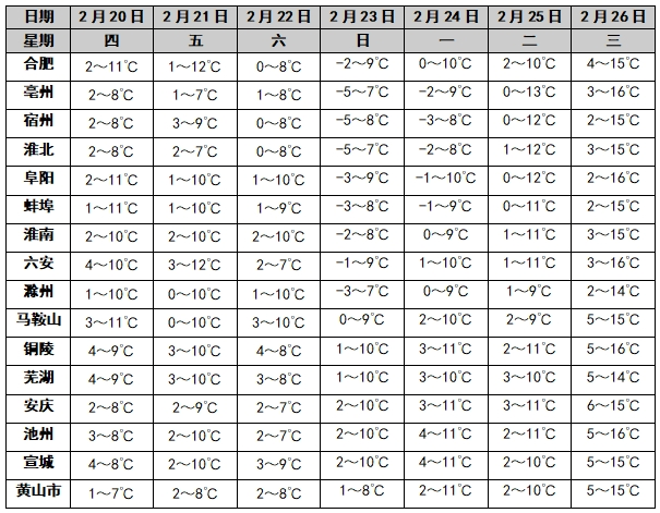 气温:受冷空气影响,20-23日我省气温将逐渐下降。冷空气过后24日早晨本省山区、淮北地区和江淮之间北部最低气温-4~-2℃,其他地区-2~0℃。24日后全省气温逐渐回升。