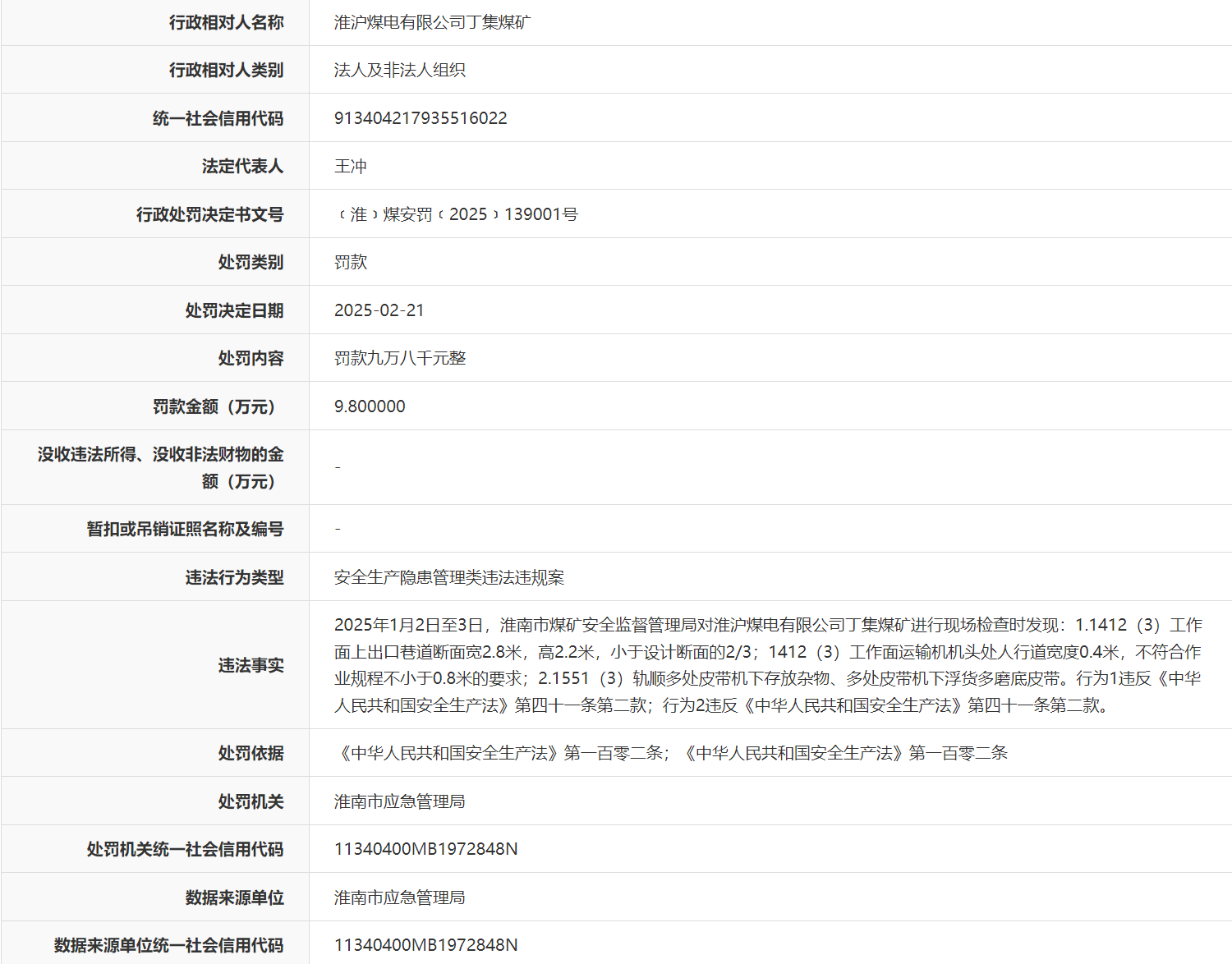 近日,信用安徽披露行政处罚信息,因涉安全生产隐患管理类等违法违规,淮浙煤电有限责任公司顾北煤矿被罚款6.8万元,行政处罚决定书文号为﹝淮﹞煤安罚﹝2025﹞110005号。