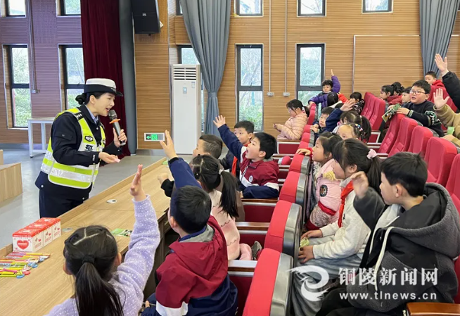 2月17日,铜陵市公安局交警支队走进铜官区田家炳小学翠湖湾校区开展“交通安全开学第一课”,以提问方式宣传交通安全知识,为学生们送上了一份特别的“开学礼”。(潘伟)