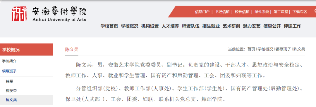 据安徽艺术学院“领导班子”更新显示:陈文兵已任安徽艺术学院党委委员、副书记。