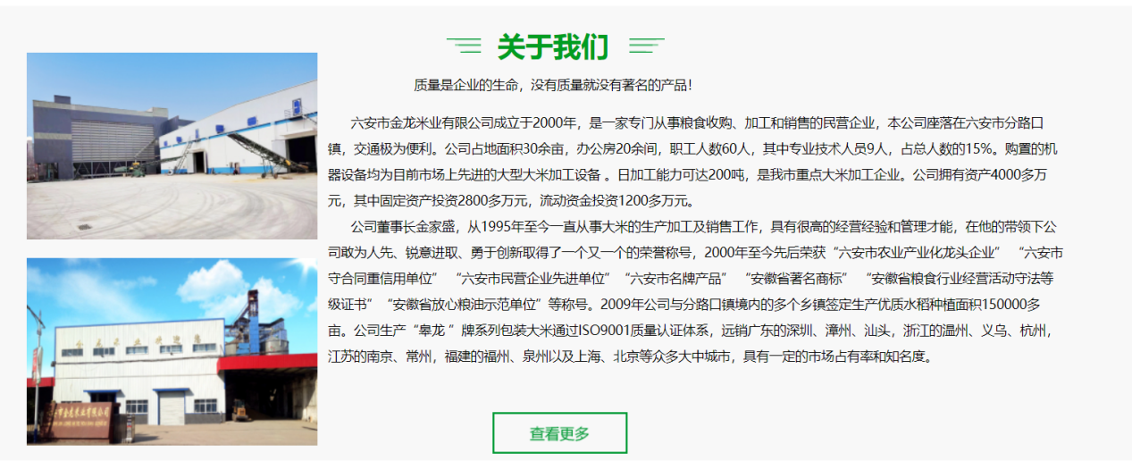 公司官网信息显示,六安市金龙米业有限公司成立于2000年,是一家专门从事粮食收购、加工和销售的民营企业,该公司官网信息显示,“质量是企业的生命,没有质量就没有著名的产品!”公司产品包括谷地美自然之美、味福季香米、皋龙皖西淠畔籼米、谷香鱼肥、虾稻米、皖西淠畔籼米等。(文/实习生 高欣雨)