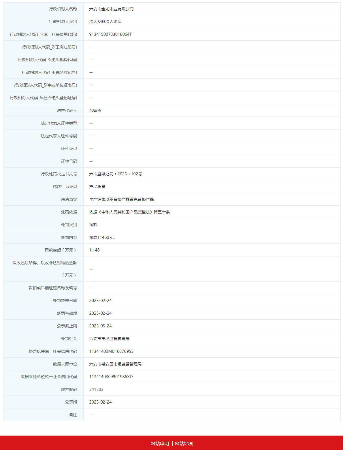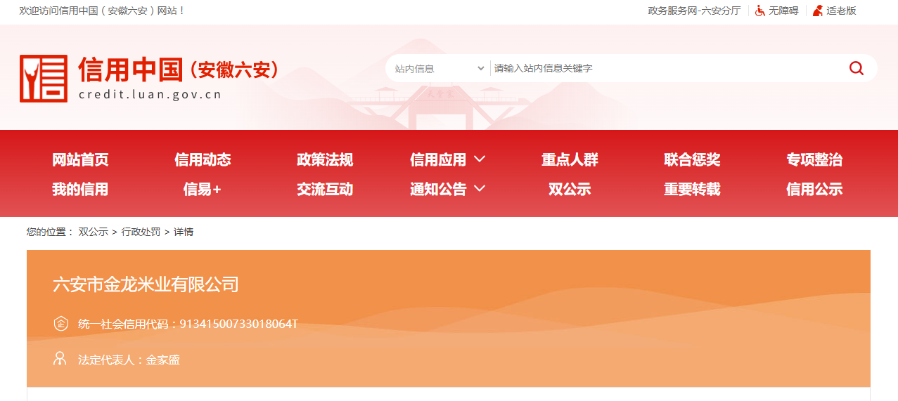 近日,信用六安披露行政处罚信息,因生产销售以不合格产品冒充合格产品,六安市金龙米业有限公司被处罚款1.146万元,行政处罚决定书文号为六市监裕处罚﹝2025﹞102号。