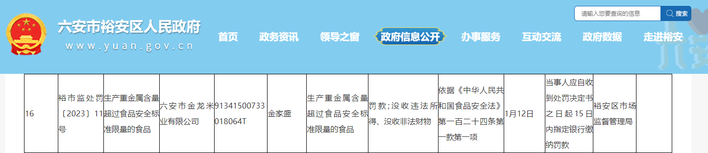 往期行政处罚信息显示,2023年1月12日,该公司因生产重金属含量超过食品安全标准限量的食品,依据《中华人民共和国食品安全法》第一百二十四条第一款第一项,六安市裕安区市场监督管理局决定对该公司处以罚款并没收违法所得、没收非法财物,行政处罚决定书文号为裕市监处罚〔2023〕11号。