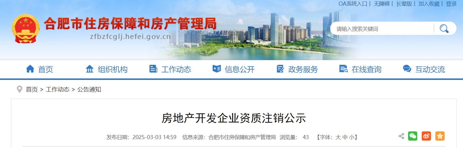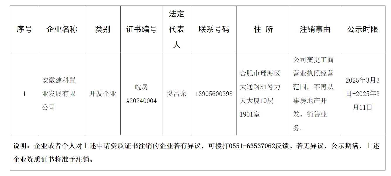 近日,合肥市住房保障和房产管理局发布公告,对房地产开发企业资质注销进行公示。详情如下: