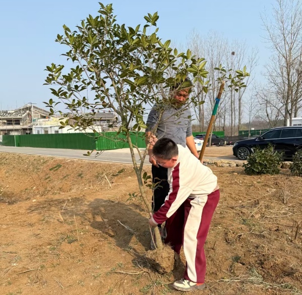 有的队员则利用周末和家人一起走进社区种植小树苗。树木植于土,生态理念植于心。挥铲挖土,挖出绿色的期望;放苗扶正,放入未来的梦想;填土回坑,培出幸福的茁壮;提桶浇水,浇出快乐的成长。