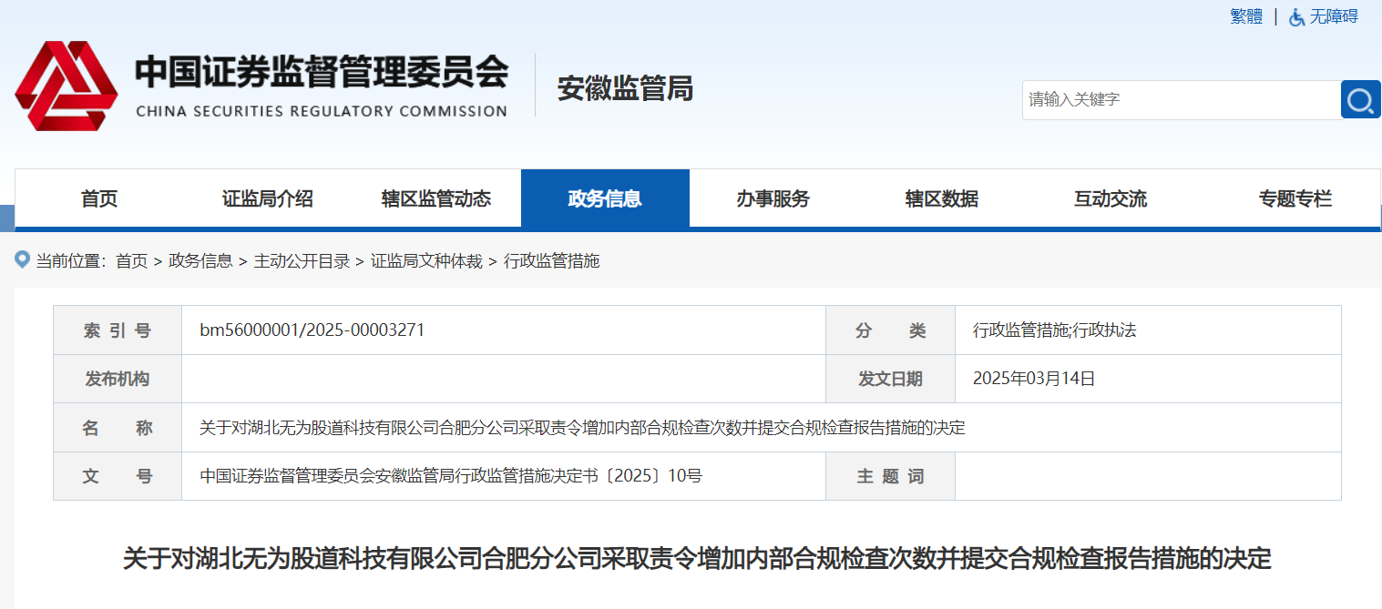 3月14日,安徽证监局网站披露行政监管信息,因廉洁从业管理不到位、财务管理不规范、营销推广存在夸大及误导性表述、风险控制不到位,湖北无为股道科技有限公司合肥分公司被行政监管。