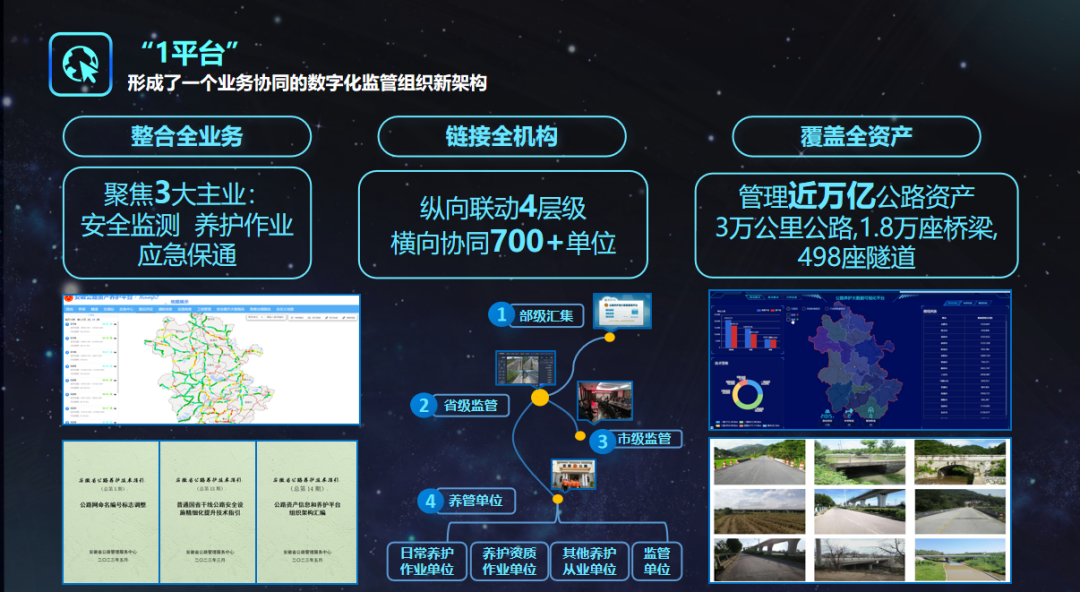 1.“1平台”——基于资产管理理念的公路资产养护管理后台:整合安全监测、养护作业、应急保通三大主业,纵向联动部、省、市和养管单位4个层级,横向协同700+单位,管理国省干线近万亿公路资产,形成一个数字化监管组织新架构。