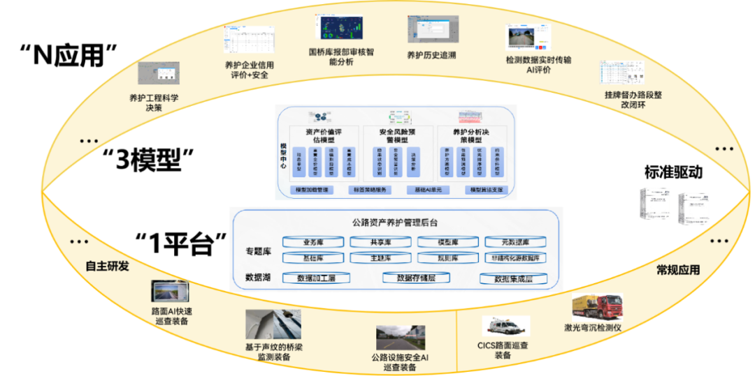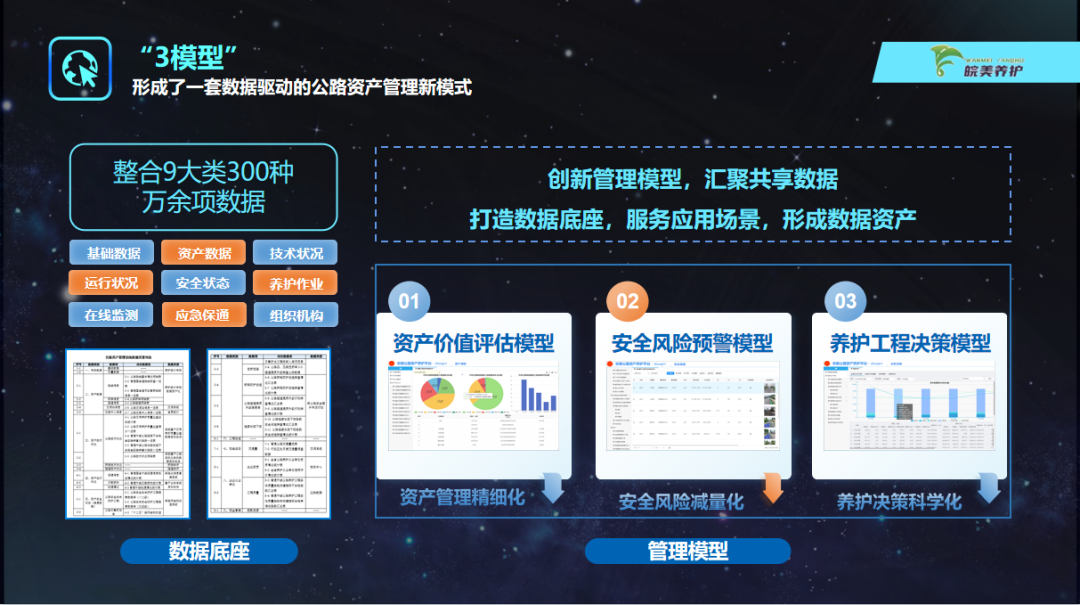 2.“3模型”——评估、预警、决策系列资产管理人工智能混合模型:基于平台汇聚的公路资产、检测监测、建养历史、应急保通等数据资源,构建了评估、预警、决策系列模型,实现资产管理精细化、安全风险减量化、养护决策科学化;同时汇聚共享数据,打造数据底座,服务应用场景,形成了一套公路资产管理新模式。