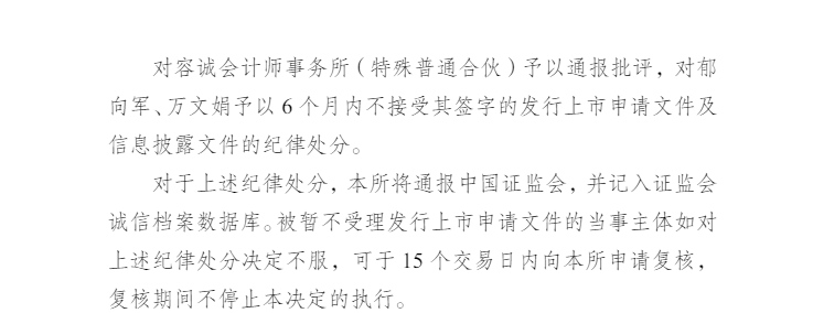 鉴于上述违规事实和情节,上海证券交易所决定对容诚会计师事务所(特殊普通合伙)予以通报批评,对郁向军、万文娟予以 6 个月内不接受其签字的发行上市申请文件及信息披露文件的纪律处分。