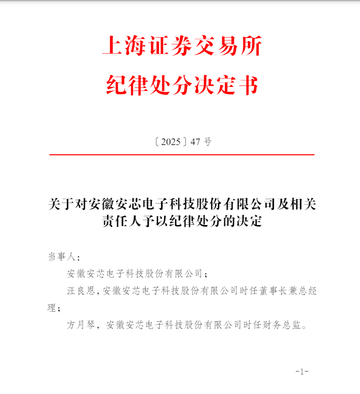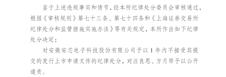 上海证券所决定对安徽安芯电子科技股份有限公司予以1 年内不接受其提交的发行上市申请文件的纪律处分,对汪良恩、方月琴予以公开谴责。