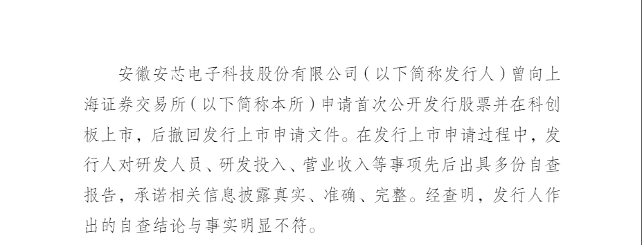 上海证券交易所纪律处罚决定书〔2025〕47 号信息显示,安徽安芯电子科技股份有限公司(以下简称发行人)曾向上海证券交易所(以下简称本所)申请首次公开发行股票并在科创板上市,后撤回发行上市申请文件。在发行上市申请过程中,发行人对研发人员、研发投入、营业收入等事项先后出具多份自查报告,承诺相关信息披露真实、准确、完整。经查明,发行人作出的自查结论与事实明显不符。