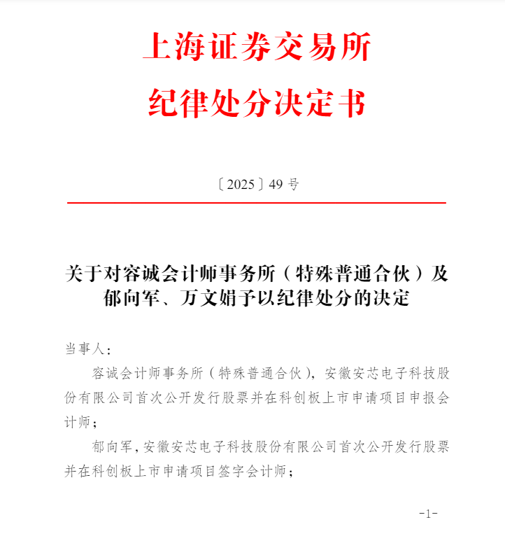 上海证券交易所纪律处分决定书〔2025〕49 号信息显示,安徽安芯电子科技股份有限公司。在发行上市申请过程中,申报会计师对发行人研发人员、研发投入、营业收入等事项先后出具多份核查报告,发表核查意见认为相关信息披露真实、准确、完整。经查明,申报会计师相关核查工作存在重大缺陷,作出的核查结论与事实明显不符。
