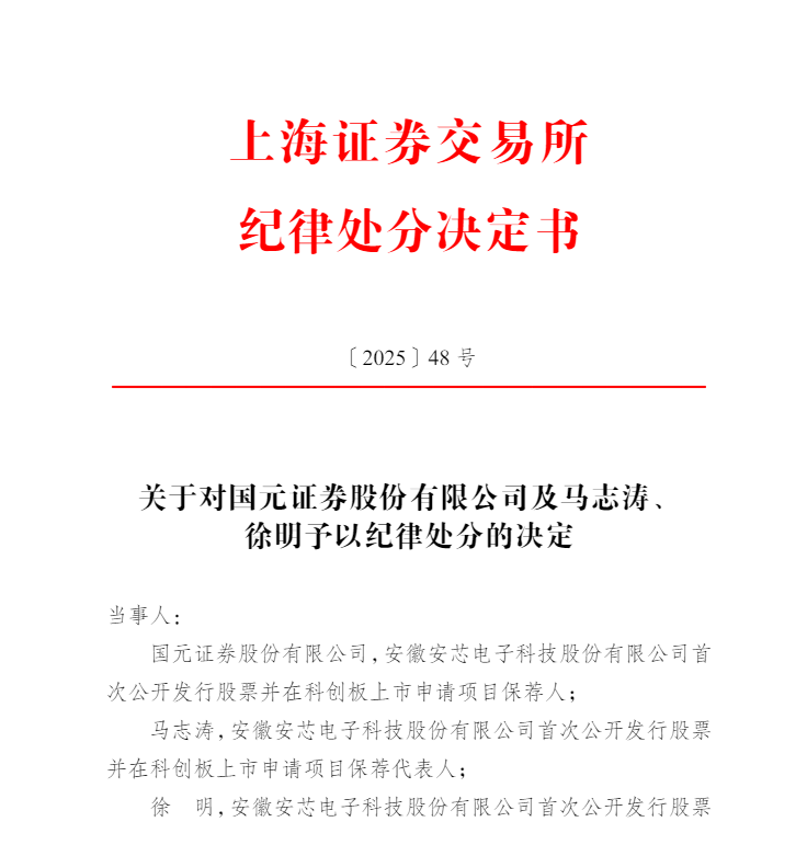 上海证券交易所纪律处分决定书〔2025〕48 号信息显示,保荐人国元证券股份有限公司存在以下违规行为: