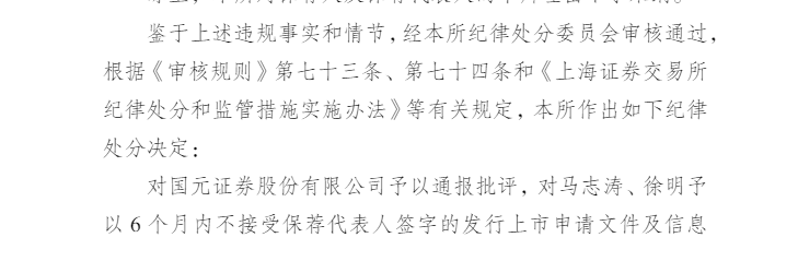 鉴于上述违规事实和情节,上海证券交易所决定对国元证券股份有限公司予以通报批评,对马志涛、徐明予以 6 个月内不接受保荐代表人签字的发行上市申请文件及信息披露文件的纪律处分。