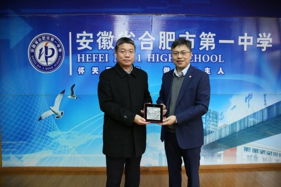 交流结束,封东来还亲自为合肥一中赠送礼品,封安保代表学校接受礼品,并合影留念。