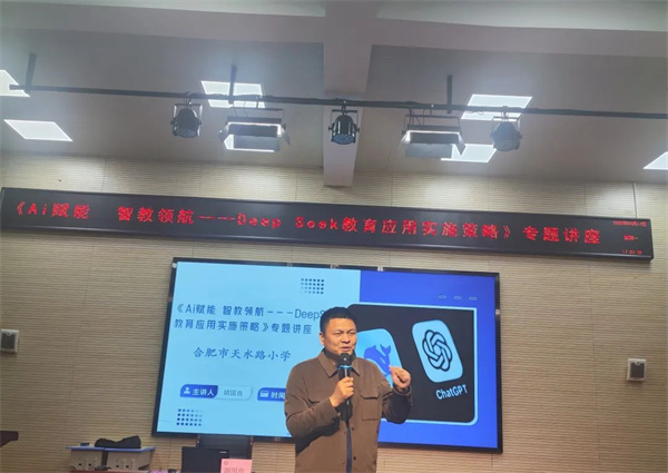 3月17日下午,合肥市天水路小学迎来了一场教育科技的前沿盛宴,合肥市隆岗小学胡国良主任应邀到校,开展题为《Ai赋能 智教领航——DeepSeek教育应用实施策略》的专题讲座。本次活动由张琦老师主持,校长苗峰携全体教师共同参与。讲座聚焦人工智能技术在教育领域的创新应用,旨在通过深度探索AI与教育的融合路径,推动智慧教育的进一步发展,为学校教育教学注入科技新动能。