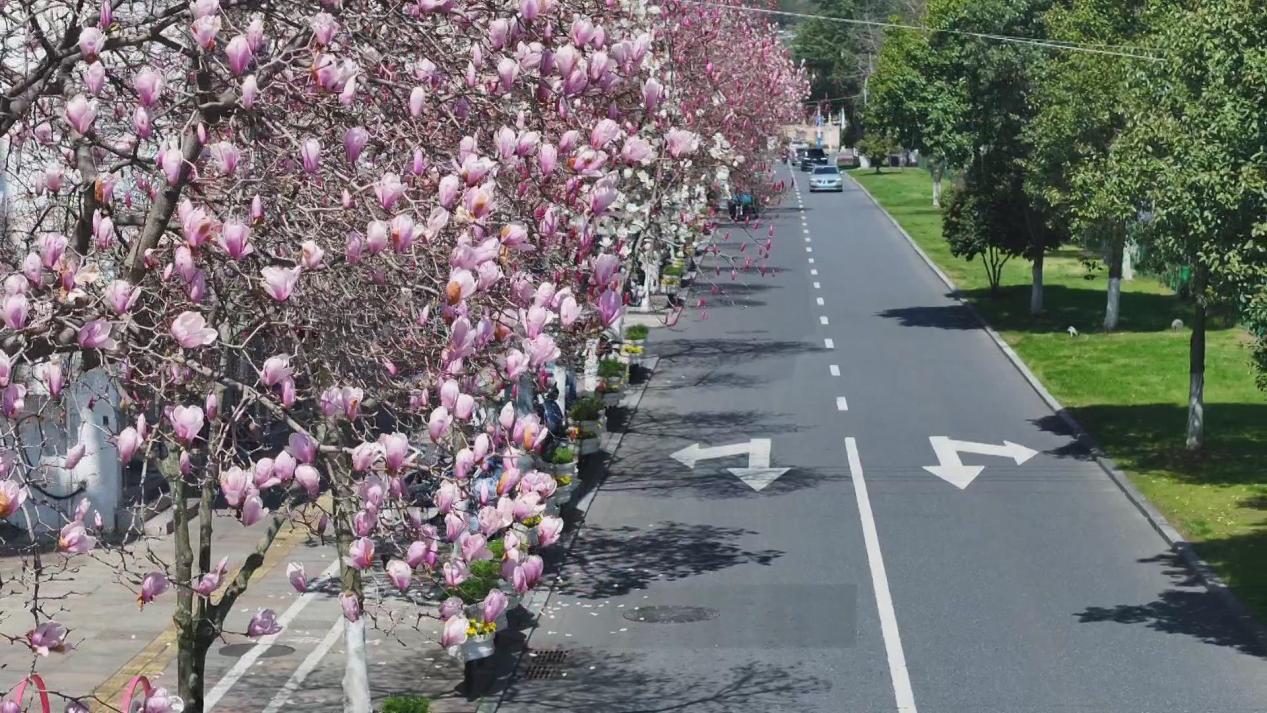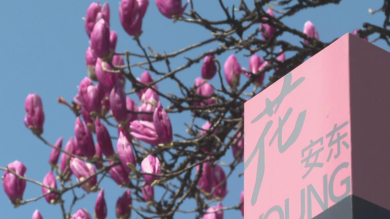 市民凌芸菲说:“今天我跟朋友来到安东路这边拍照,看见玉兰花开非常美。我们感受到了浓烈的春天气息,路边还有很多粉红色的装扮,我觉得特别符合春天的主题。”