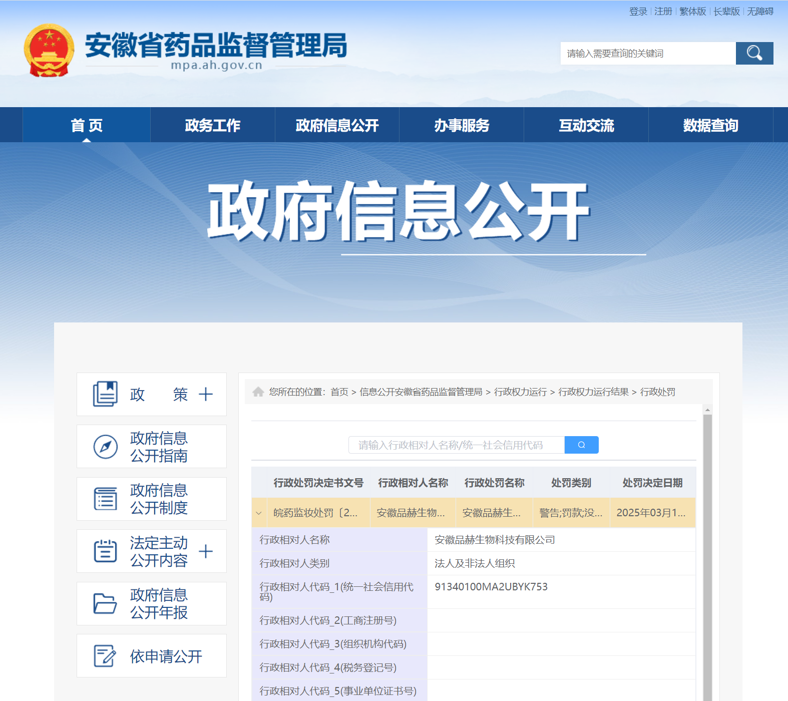 近日,安徽省药监局披露行政处罚信息,因随意改变普通化妆品配方及使用过期化妆品原料,安徽品赫生物科技有限公司被罚款20.27314万元,没收违法所得0.21474万元,行政处罚决定书文号为皖药监妆处罚〔2025〕1-5号。