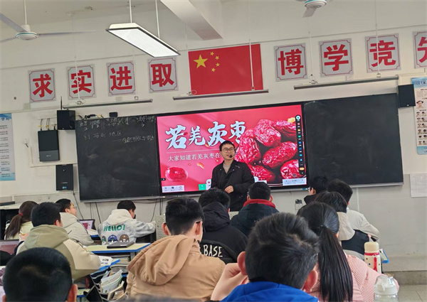 教学中,高明老师的授课课题为《西北地区—自然特征与农业》,他以新疆若羌灰枣为钥匙,设计了寻枣—观枣—品枣—知枣的教学环节,依托“智慧课堂”,层层解密西北自然环境的独特性与人类智慧。整个教学充分展现了信息技术赋能学生学习的场景。课堂终章,教室秒变“公益助农直播间”,两名学生化身主播,其他学生踊跃参与,在学生们的精彩演绎中,课堂教学生成悄然发生。当抽象的地理知识转化为实际的助农行动,学习便有了温度与力量。