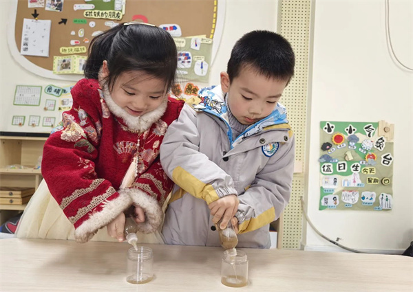 中班孩子们化身“环保小卫士”,动手操作简易净水实验。他们将混有泥沙、果皮的污水倒入过滤装置,耐心地观察水流逐渐清澈的过程。“快看!水真的变干净了!”幼儿兴奋地举起过滤瓶。通过老师们的讲解,孩子们也感受到过滤水真是太复杂、太不容易了,要把水过滤干净要经过这么多道程序。滤水实验,不仅锻炼了动手能力,更让孩子们体会到每一滴净水的来之不易。