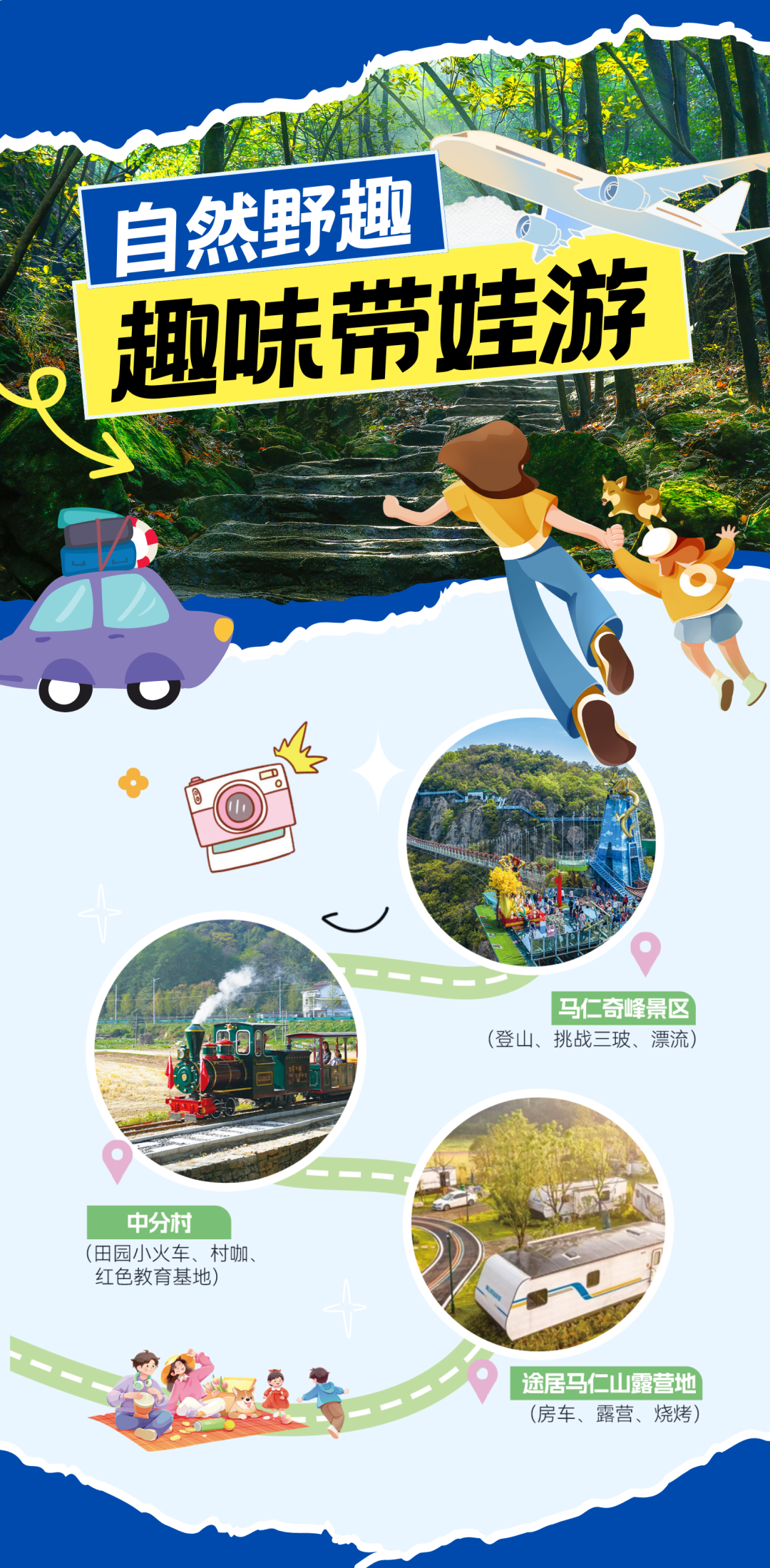 挑战马仁奇峰“三玻”漂流,带娃乘坐田园小火车,在春风里露营烧烤,草坪撒欢,房车夜宿,其乐无穷。