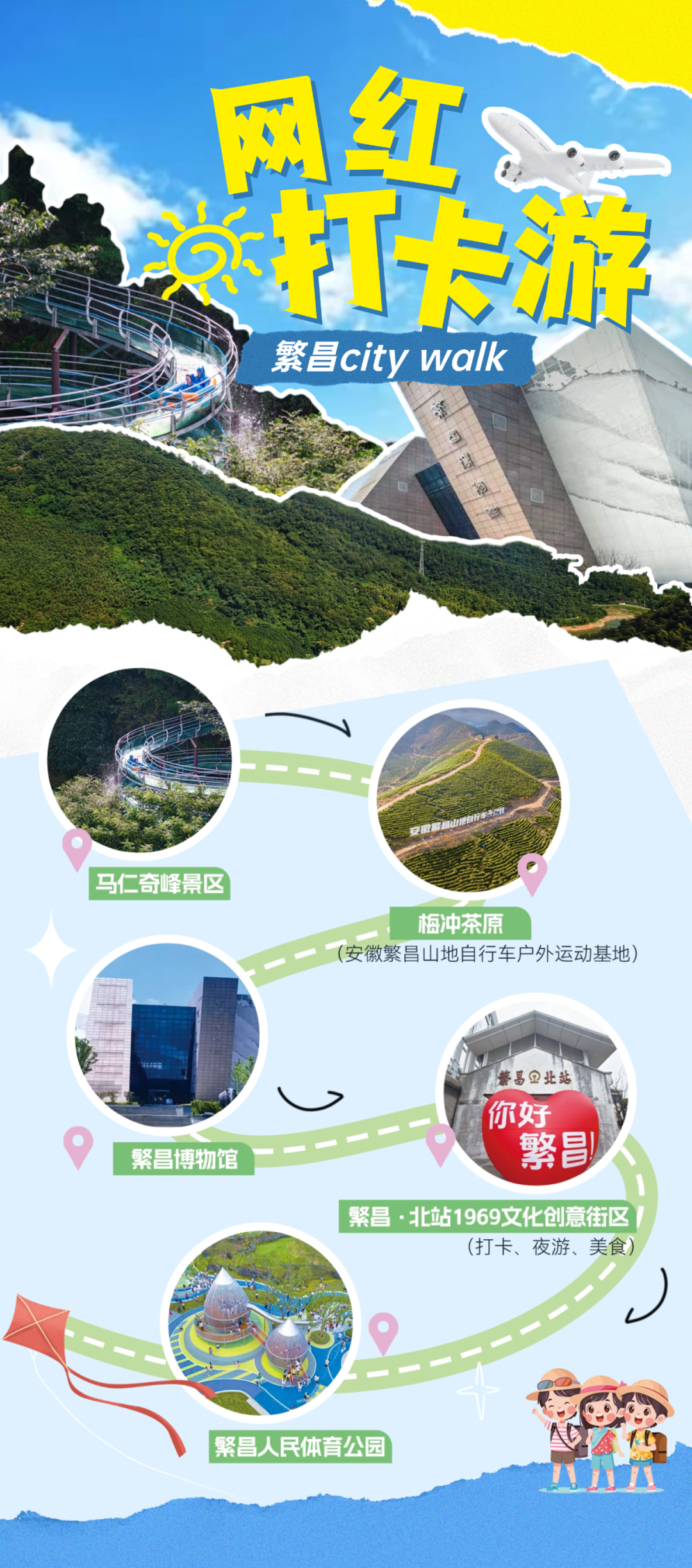 马仁奇峰景区→梅冲茶园/繁昌山地自行车户外运动基地→繁昌博物馆→繁昌北站1969文化创意街区→繁昌人民体育公园