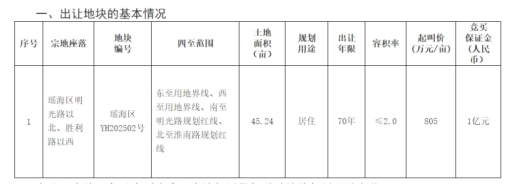 地块编号瑶海区YH202502号,位于瑶海区明光路以北、胜利路以西,东至用地界线、西至用地界线、南至明光路规划红线、北至淮南路规划红线,为居住用地,出让面积45.24亩,容积率≤2.0,起报总价3.64亿元。