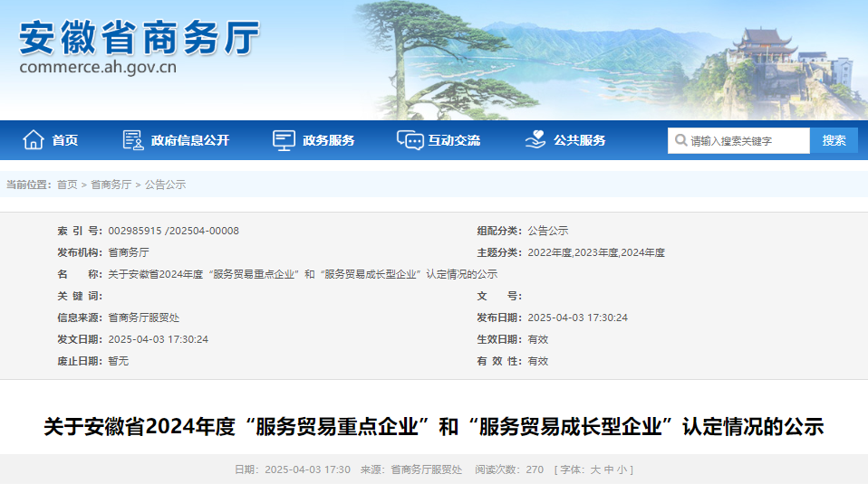 近日,安徽省商务厅组织开展2024年度“服务贸易重点企业”和“服务贸易成长型企业”认定工作。