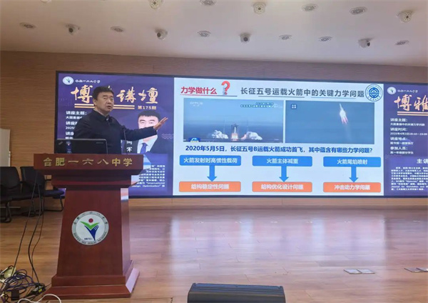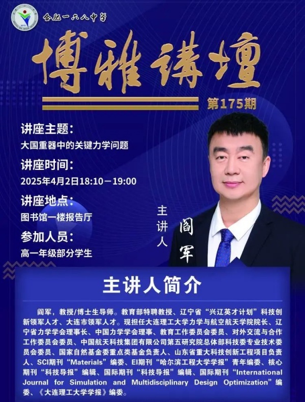 近日,合肥一六八中学迎来了一场高水平的学术盛宴。大连理工大学力学与航空航天学院院长、教育部特聘教授阎军应邀做客第175期博雅讲坛,以“大国重器中的关键力学问题”为主题,为师生们带来了一场兼具科学深度与人文情怀的精彩讲座。