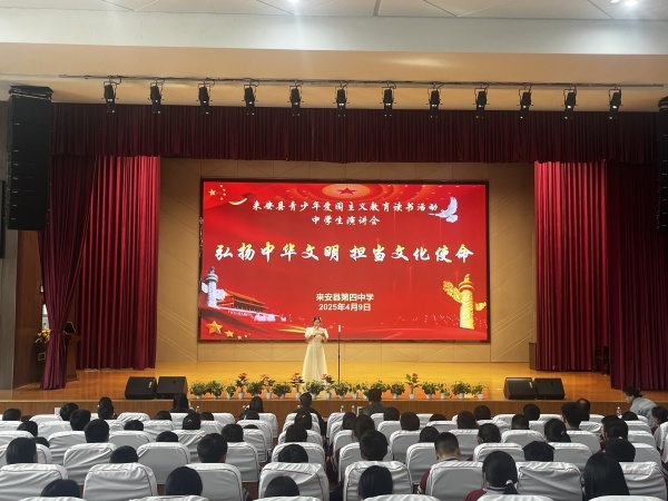 为弘扬中华文明,激发学生的爱国热情,增强民族自豪感和文化自信,4月9日下午,来安县第四中学成功举办了以“弘扬中华文明 担当文化使命”为主题的七年级爱国主义读书活动演讲会。18名来自七年级的参赛选手齐聚一堂,展开了一场精彩的思想与口才的较量。