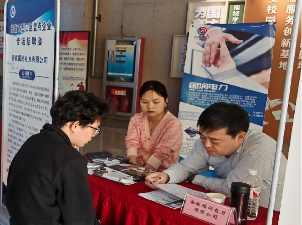 座谈会结束后,与会人员莅临专场招聘会现场,看望慰问企业招聘人员和应聘毕业生。据统计,安徽新正城乡发展集团等6家企业共提供就业岗位100个,吸引铜陵学院100多名2025届毕业生前往现场应聘。