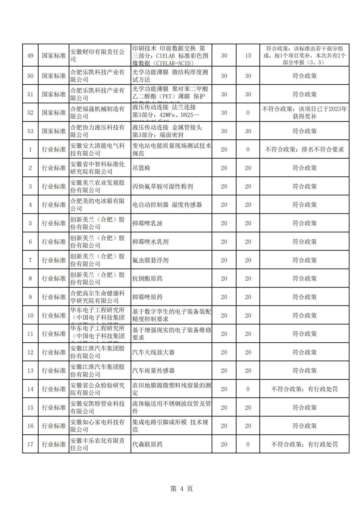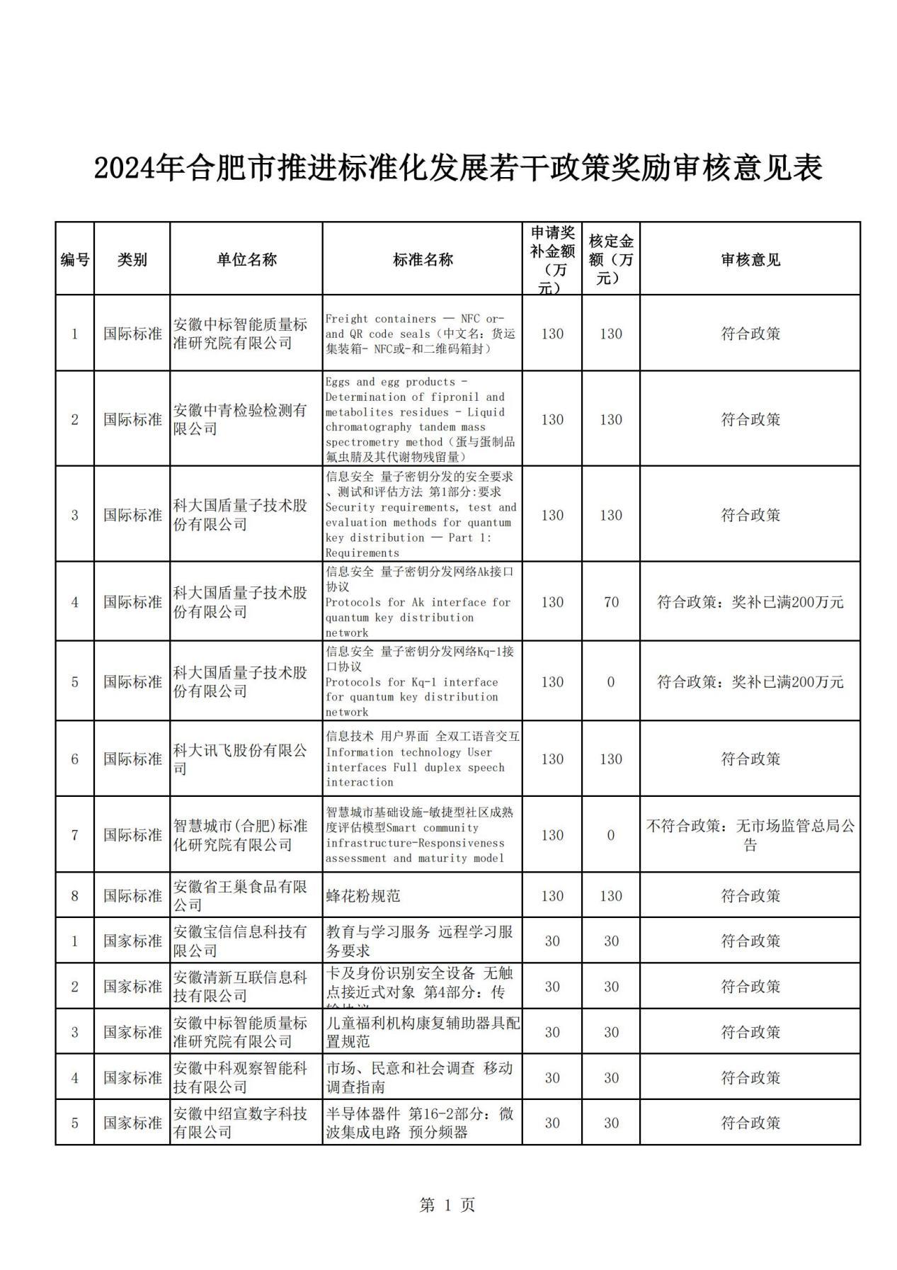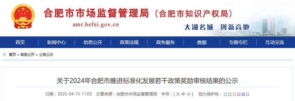 近日,合肥市市场监督管理局发布《关于2024年合肥市推进标准化发展若干政策奖励审核结果的公示》。