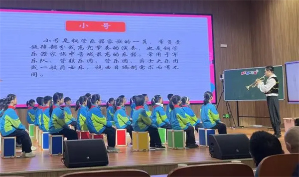 活动以展示课+交流研讨+专家报告的形式展开。上午的课堂展示环节中,第一节是池州市贵池区城关小学的张靖老师执教《那不勒斯舞曲》。张老师以“长江号”游轮创设意大利旅游情境,自然引出课题,以“听”为钥唤醒学生审美感知,运用“音画联觉”教学策略。更亲自现场吹奏小号,让学生直观感受乐器音色魅力。学生随乐舒展肢体,尝试编创简单舞蹈动作,通过多元感官参与,沉浸式感受《那不勒斯舞曲》的独特风情。