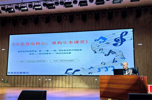 随后,上海团队专家——上海市闵行区教育学院刘庆江教授带来专题讲座《立足音乐核心,重构生本课堂》。刘教授以轻松幽默的语言,通过亲切交流分享其教学经验。他指出,音乐艺术的终极追求在于真善美之境,评价音乐可依循三重标准:音乐——美好的音乐——讲自己的故事。他强调,音乐教育需依托音准、节奏、音色等核心要素的感知与实践,在提升音乐技能的基础上实现素养养成;针对音乐课堂中的问题,应回归音乐本质,以专业性的音乐手段予以解决。