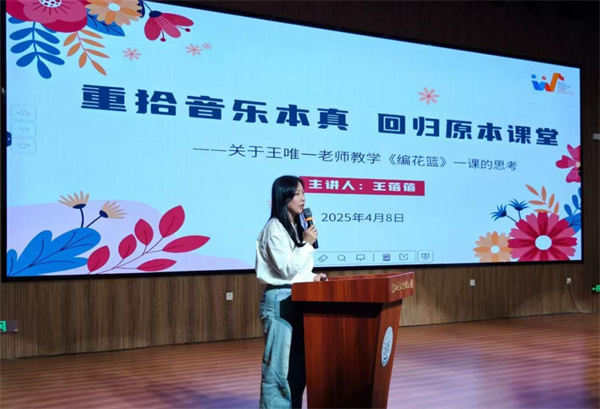 下午的研讨环节中,三位授课教师聚焦课堂实效进行教学反思。接着由合肥市王蓓蓓小学音乐(教育)名师工作室王蓓蓓老师分享《重拾音乐本真 回归原本课堂——关于王唯一老师教学〈编花篮>一课的思考》。王老师从过往课堂的反思——偏离音乐本真的课堂,到课堂探寻——音乐本真与原本课堂的内涵,最后到课堂实践——减法中的加法。她认为音乐课堂教学的“本真”至少包含三个维度:一是文化本真——从“教歌曲”到“传薪火”,二是审美本真——从“精准复制”到“个性表达”,三是实践本真——从“教师演课”到“学生能力展现”,四是再出发:坚定了回归音乐本真的教学信念。重拾音乐本真,回归原本课堂,是一个持续不断的过程。在未来的教学中,工作室及成员教师将继续反思自己的教学行为,不断探索创新教学方法,为学生打造更加优质的音乐课堂。