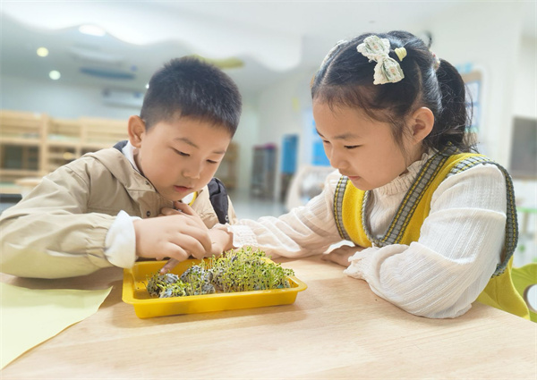 大班的孩子们用创意守护地球未来,他们将废旧纸张浸泡、揉捏成“地球”,嵌入代表生命的种子,再用颜料绘出斑斓的海洋与森林。每天浇水观察,静待嫩芽破土。一颗颗“种子地球”不仅是手工作品,更承载着孩子们对生态的思考:守护自然,从一颗种子的希望开始!