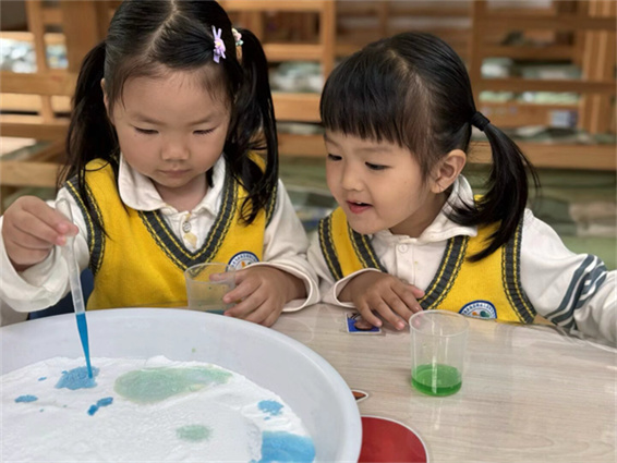 在老师的引导下,小班的萌娃们化身“环保科学家”,通过趣味实验探索地球奥秘!孩子们将蓝色与绿色食用色素滴入醋中,再与小苏打发生“酸碱大碰撞”。随着“嘶嘶”声响起,气泡翻涌的“海洋”与“陆地”逐渐成形,孩子们在观察与操作中,直观感受自然反应的奇妙,萌发保护地球的绿色初心。