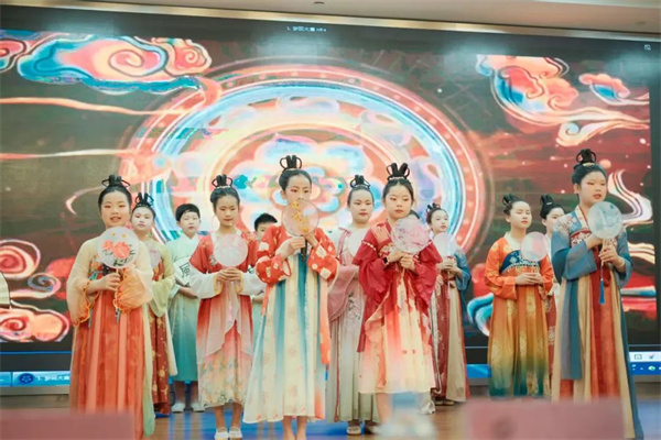 五年级的《梦回大唐》以灵动的演绎带观众穿梭于长安街头,感受诗仙诗圣笔下的盛世风华;《诗词里的中国》巧妙串联各朝佳作,用豪迈与婉约交织的诗韵勾勒出五千年文明长卷;《诗韵四季》将二十四节气歌谣融入诵读,让自然时序的韵律与诗词之美相得益彰。