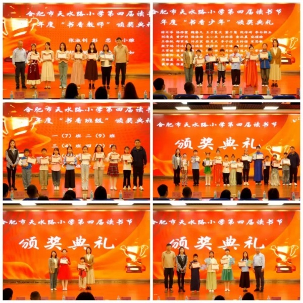 活动中还穿插着书香教师、书香班级、书香少年及展演活动的颁奖环节。获奖代表从颁奖嘉宾手中接过荣誉证书,灿烂笑容与热烈掌声交织成最美画卷。最后,活动在天小宣传视频中落下帷幕。