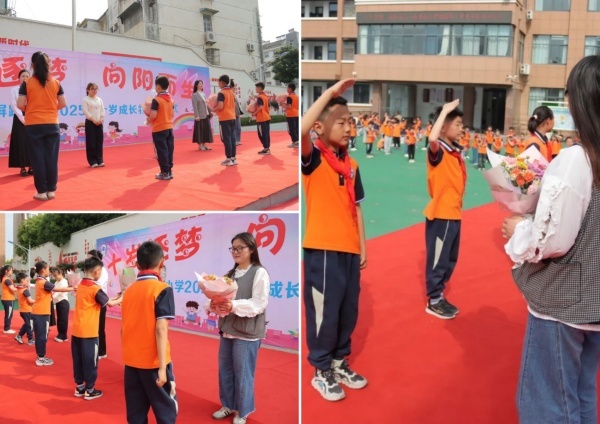 紧接着,孩子们面向敬爱的老师,挺直腰板,神情庄重地敬上一个标准的队礼,将手中的鲜花献给辛勤培育自己的老师。