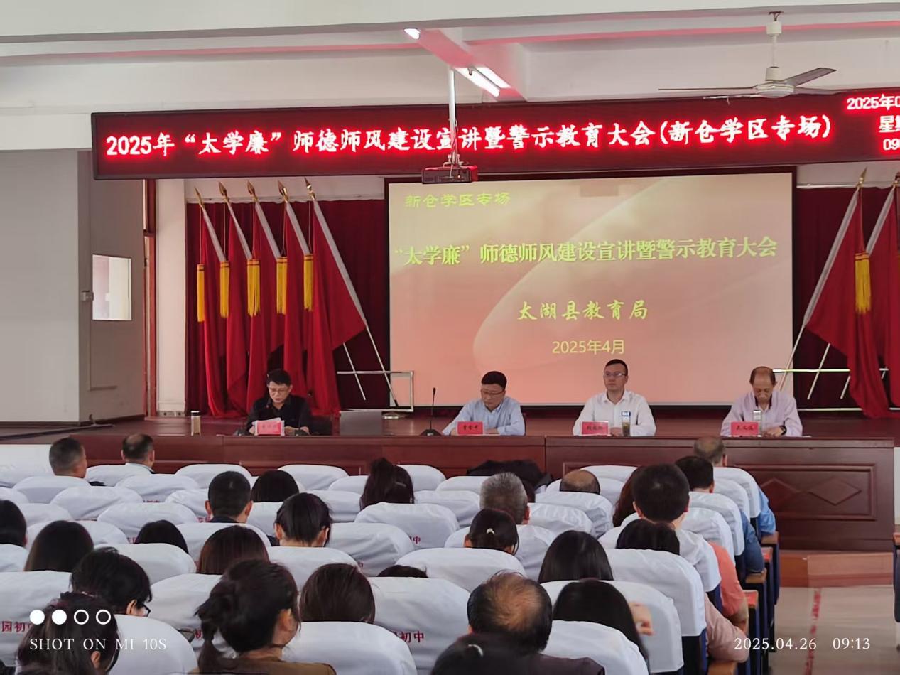 4月26日,太湖县新仓镇在花园初中召开“太学廉”师德师风建设宣讲暨警示教育大会,新仓学区中小学、幼儿园教师350余人参加会议。