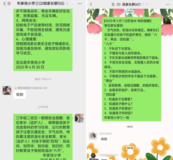 为强化家校协同,学校通过线上线下多渠道向家长群每日发送安全提醒,要求家长履行假期监护职责,重点关注孩子外出动向,避免前往危险水域。