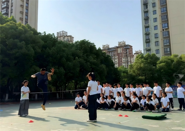 体育示范课上,柳青老师化身“运动指挥官”,以活力四射的互动游戏开启热身环节。在跨越式跳高教学中,他运用动态示范与分步拆解,将“助跑、起跳、腾空、落地”四个关键动作分解成趣味十足的训练模块。“倾斜式跳高杆”的设置,降低了初学者的心理压力,不同高度的跳高架则满足了学生的个性化需求。令人印象最深刻的是“飞夺泸定桥”情景模拟游戏,学生们分成四支“红色运输小队”,在接力运送“战略物资”的过程中,既锻炼了体能,又在沉浸式体验中深刻感受到革命先辈不畏艰险、勇往直前的精神。