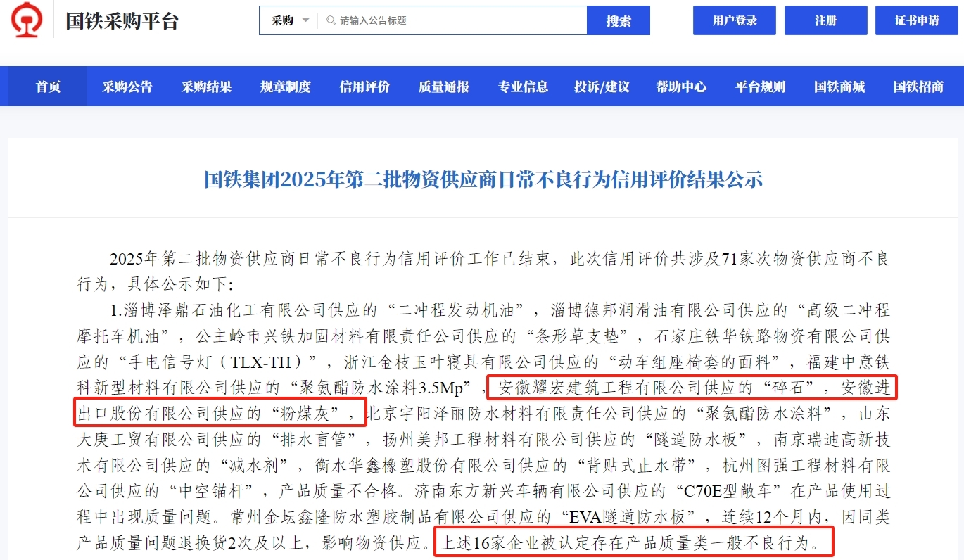 公告内容显示,安徽耀宏建筑工程有限公司供应的“碎石”、安徽进出口股份有限公司供应的“粉煤灰”产品质量不合格,该两家被认定存在产品质量类一般不良行为。