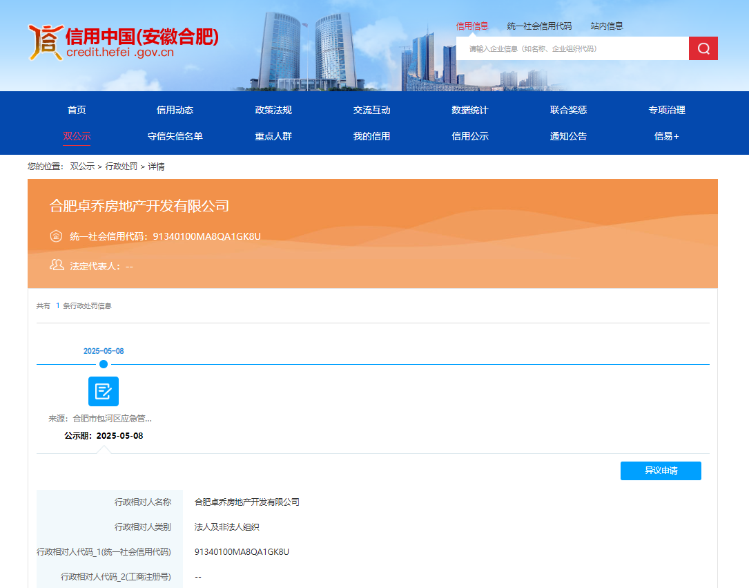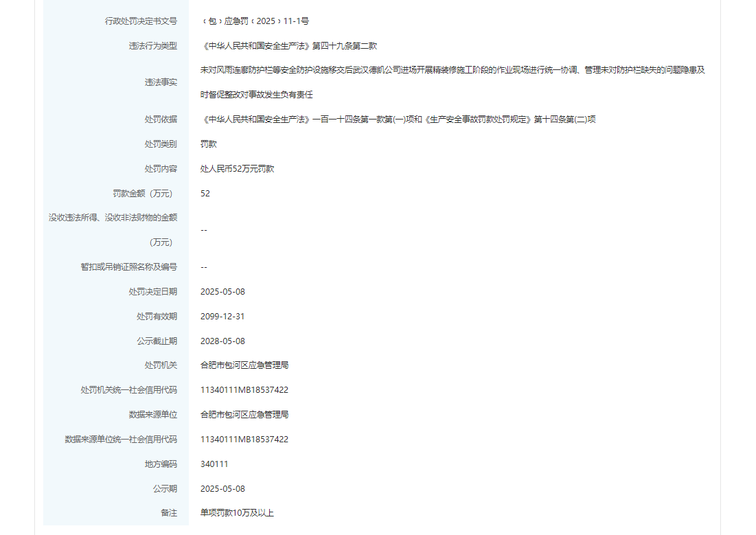 近日,信用安徽披露行政处罚信息,合肥卓乔房地产开发有限公司罚款52万元,行政处罚决定书文号为﹝包﹞应急罚﹝2025﹞11-1号。