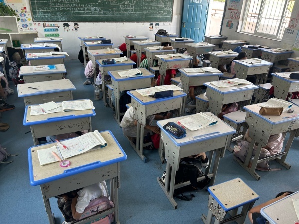 2025年5月12日下午14时28分,定远县藕塘小学5.12防震疏散演练正式开启。第一声警报响起,学生们迅速抱头蹲在课桌下躲避;第二声警报响起,他们按照既定疏散路线,紧张有序地撤离到操场空旷地带,各班级教师全程陪同指导。