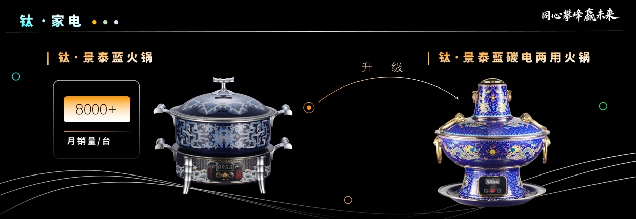 在本次峰会中,荣电集团发布的电饭煲、电压力锅、茶吧机等家电产品,不仅采用了纯钛内胆,还创新性地融入了硒(锌)块,实现了健康功能的全新升级。与此同时,钛食材净化器、钛景泰蓝碳电两用火锅等全新钛产品的惊艳亮相,更是重新定义了高端健康家电的标准,为用户带来了全场景的健康生活体验。