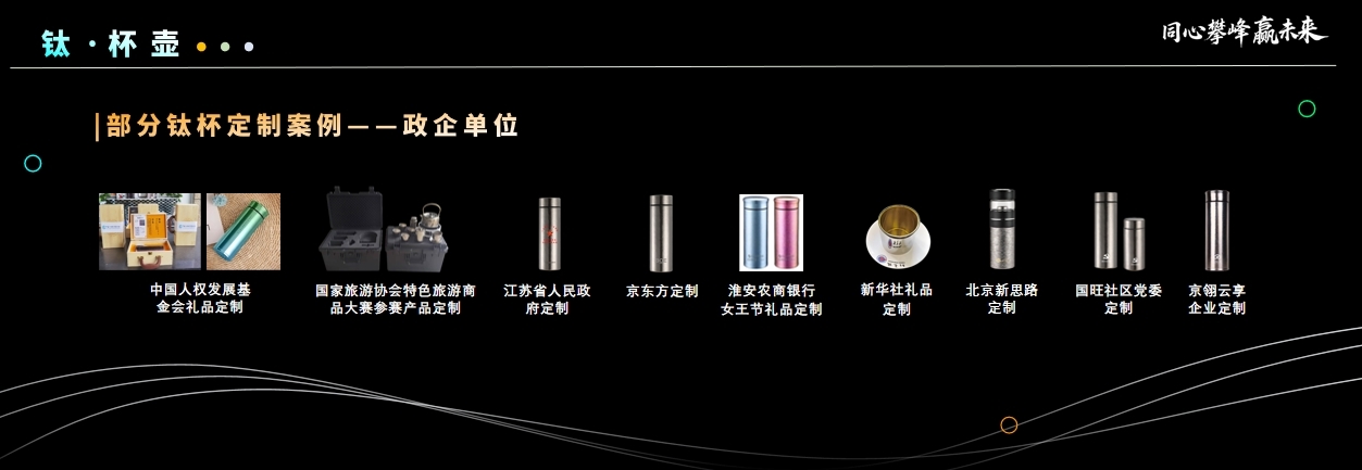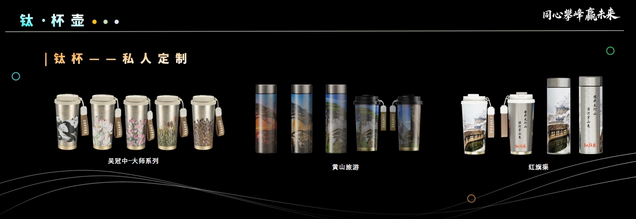 目前,集团杯壶产品主要分为本色、结晶、镜面、微雕水转印四大系列,同时还能利用阳极氧化工艺,将多种风格图案精准刻复于钛板之上,充分满足了用户和政企的定制需求。无论是日常出行还是商务办公,荣电集团的钛杯壶都能为用户带来便捷、健康、时尚的饮水体验。